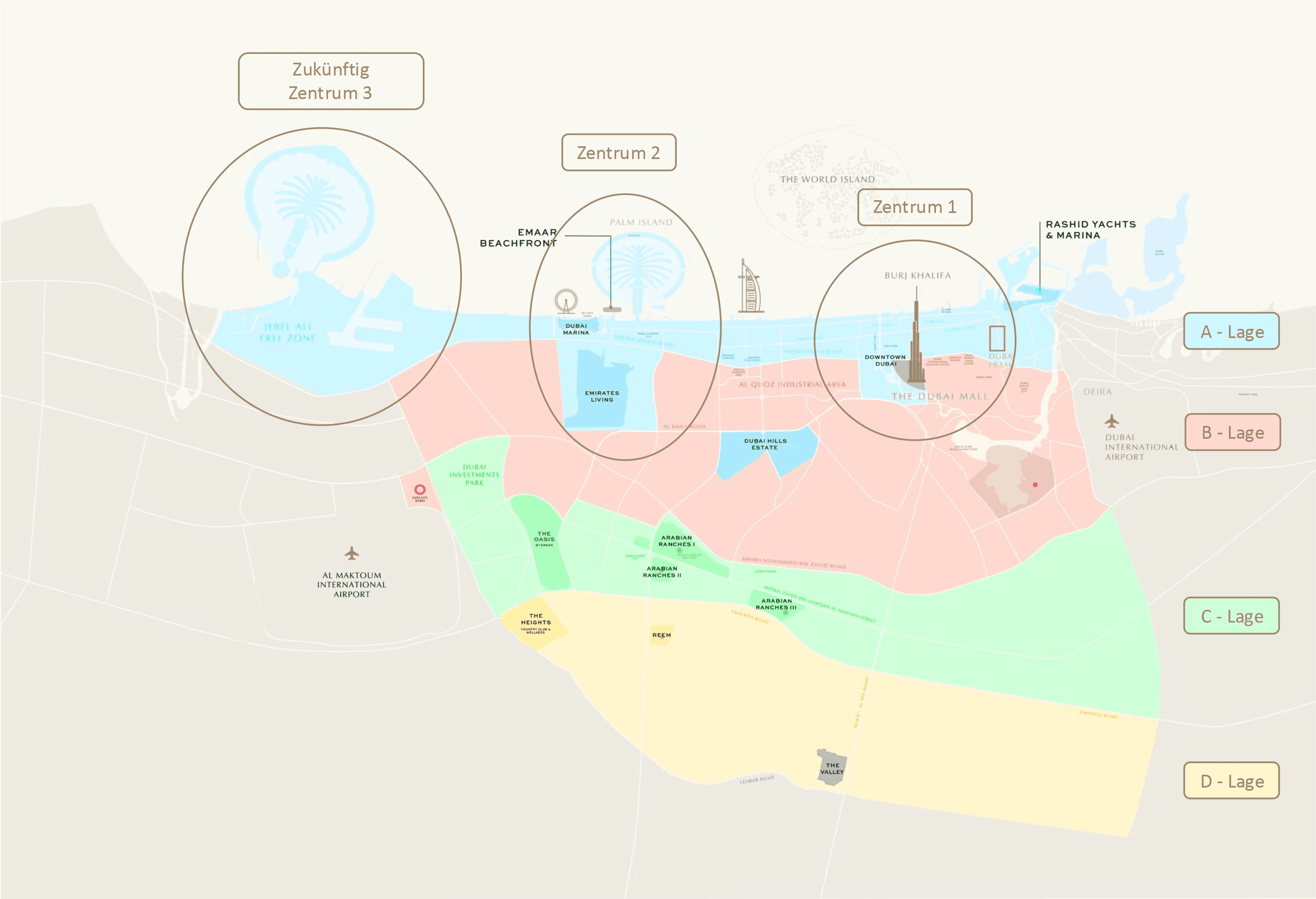 Neue Gebiete wie Dubai Islands oder Palm Jebel Ali werden systematisch erschlossen, während bestehende Zentren wie Downtown, Marina und Business Bay stabilisiert und gezielt weiterentwickelt werden. Besonderer Fokus liegt auf Mobilität, Grünflächen und einer deutlicheren Trennung zwischen Wohn- und Gewerbeclustern.
